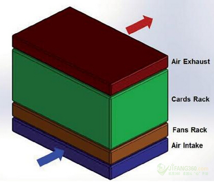冷却系统的组织,是为了使其符合机架供应商的标准。如图1所示,其显示了我们最终的设计草图。进气口是在前端的底部,而空气的排出口是在顶部的背面或顶部。空气流是从机架的底部流到顶部。最小空气流量为每秒0.2立方米(m3/s)或420立方英尺每分钟(cfm)。这一空气流被定义了,以便该系统将能够与现有的卡和机架向后兼容。机架的大小被固定在大约0.4 m x 0.44 m x 0.25 m (H x W x D),这意味着系统中的空气每秒将被替换约四次。